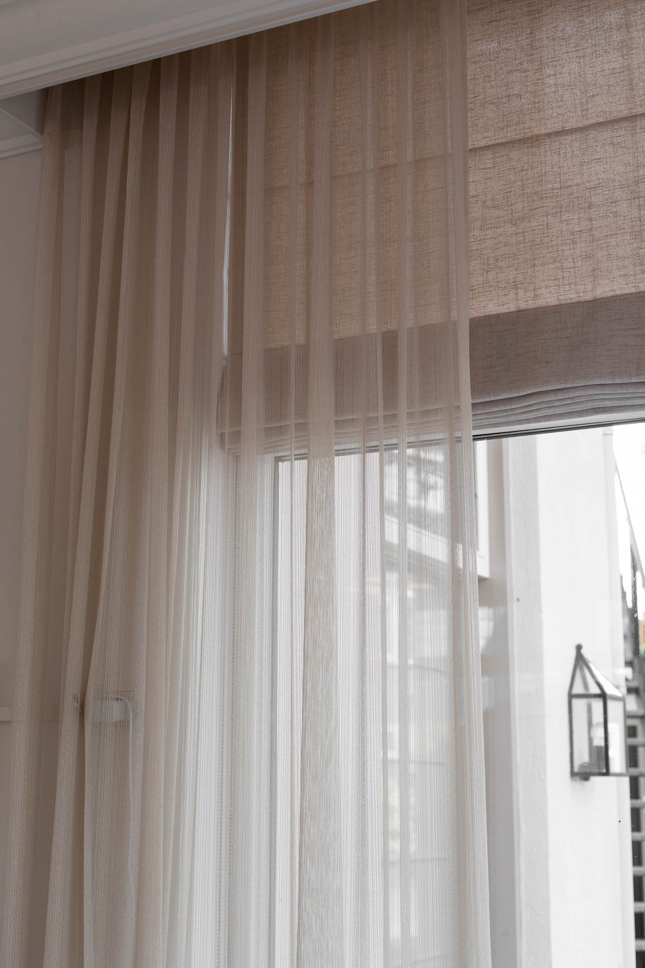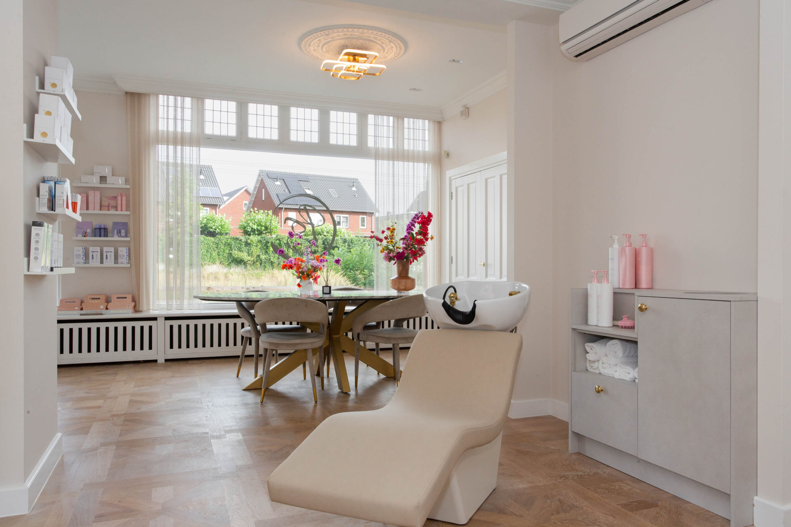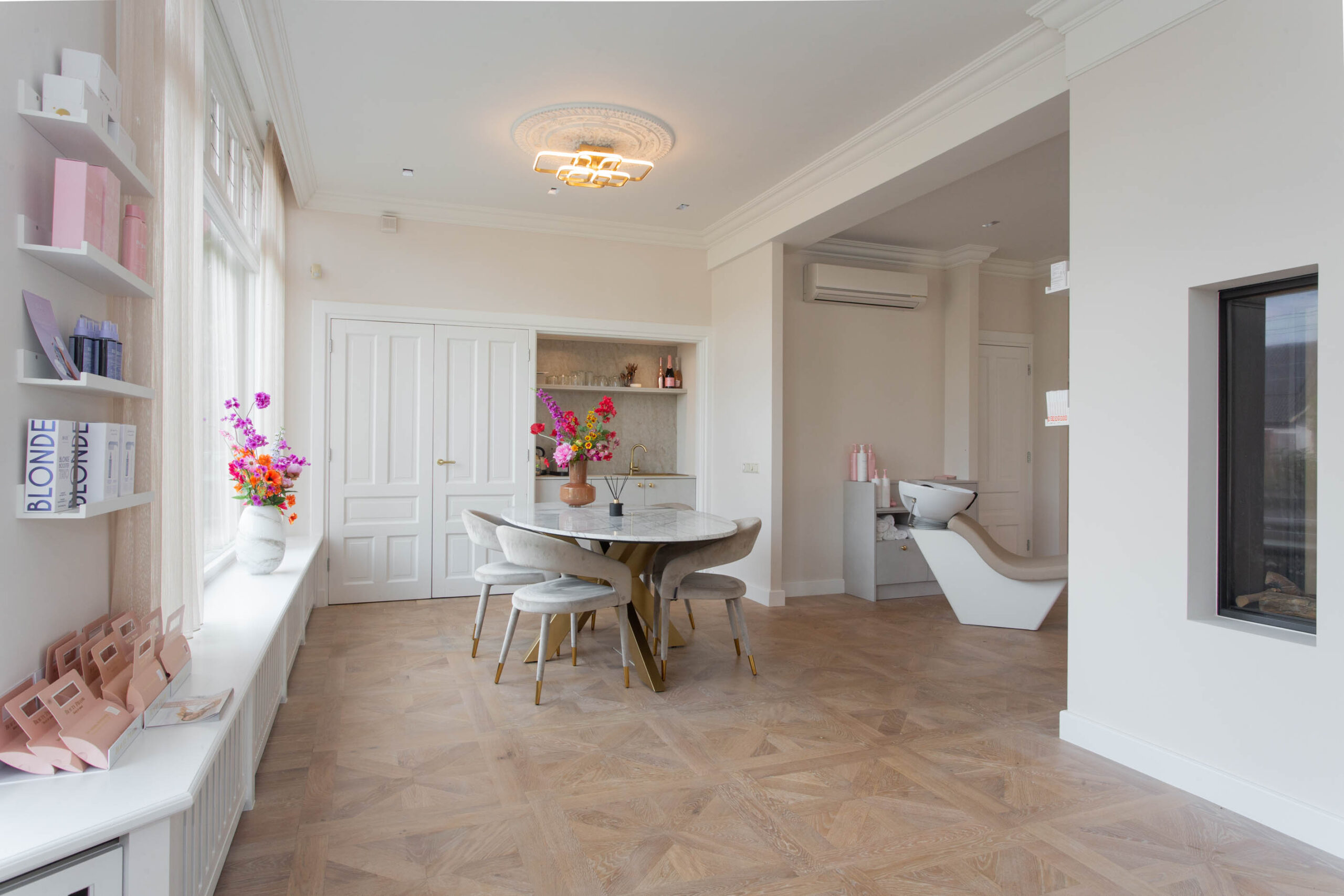 Voor Beautysalon Oosterbeek hebben we gebruikgemaakt van de elegantie van beige tinten. Dit neutrale kleurenpalet creëert een rustgevende achtergrond die perfect harmonieert met diverse stijlen en esthetiek. Beige straalt warmte uit en draagt bij aan een kalme atmosfeer in de ruimte, in lijn met de wensen van onze klant. We hebben de prachtige houten vloer opnieuw opgeschuurd om deze nieuw leven in te blazen. De champagnekleurige vitrage voegt een vleugje luxe toe aan het interieur, zonder overdreven opvallend te zijn, en zorgt ervoor dat het natuurlijke licht de kamer binnenvalt en een warme gloed verspreidt.