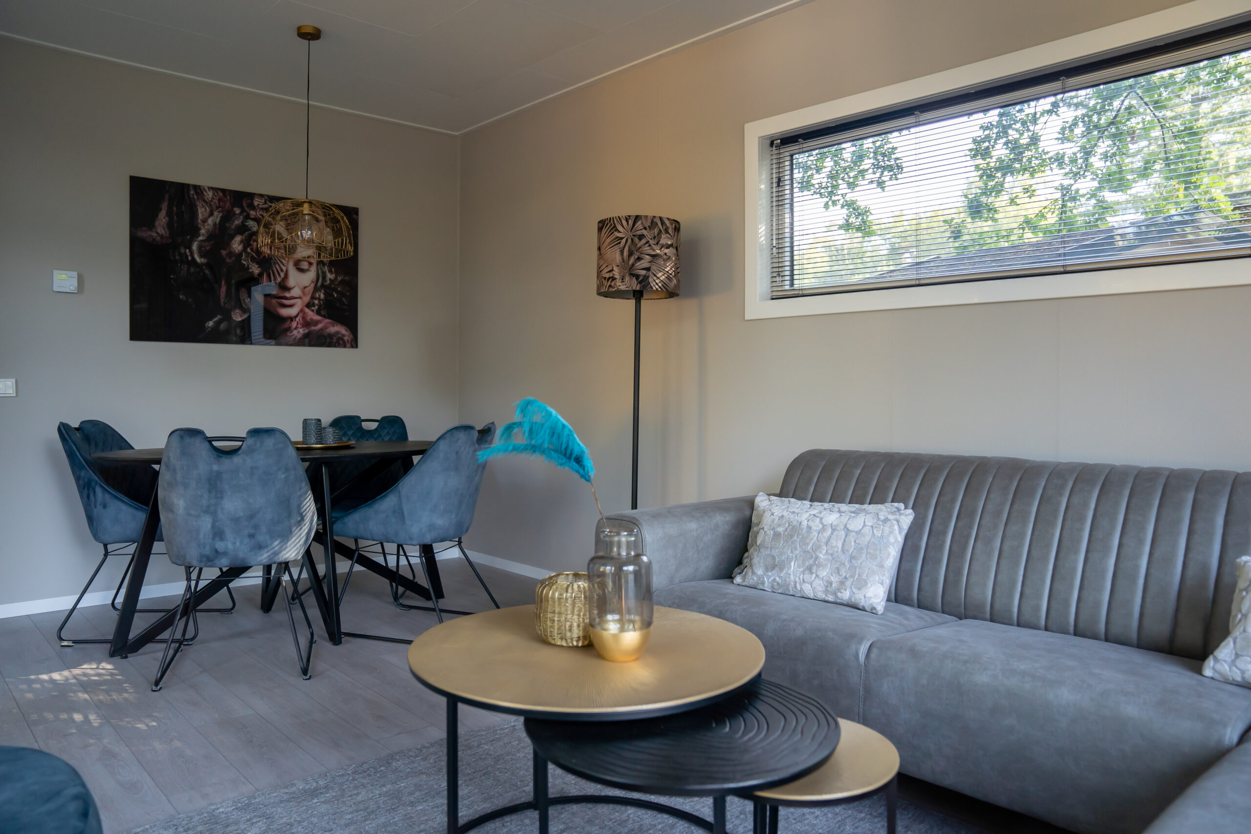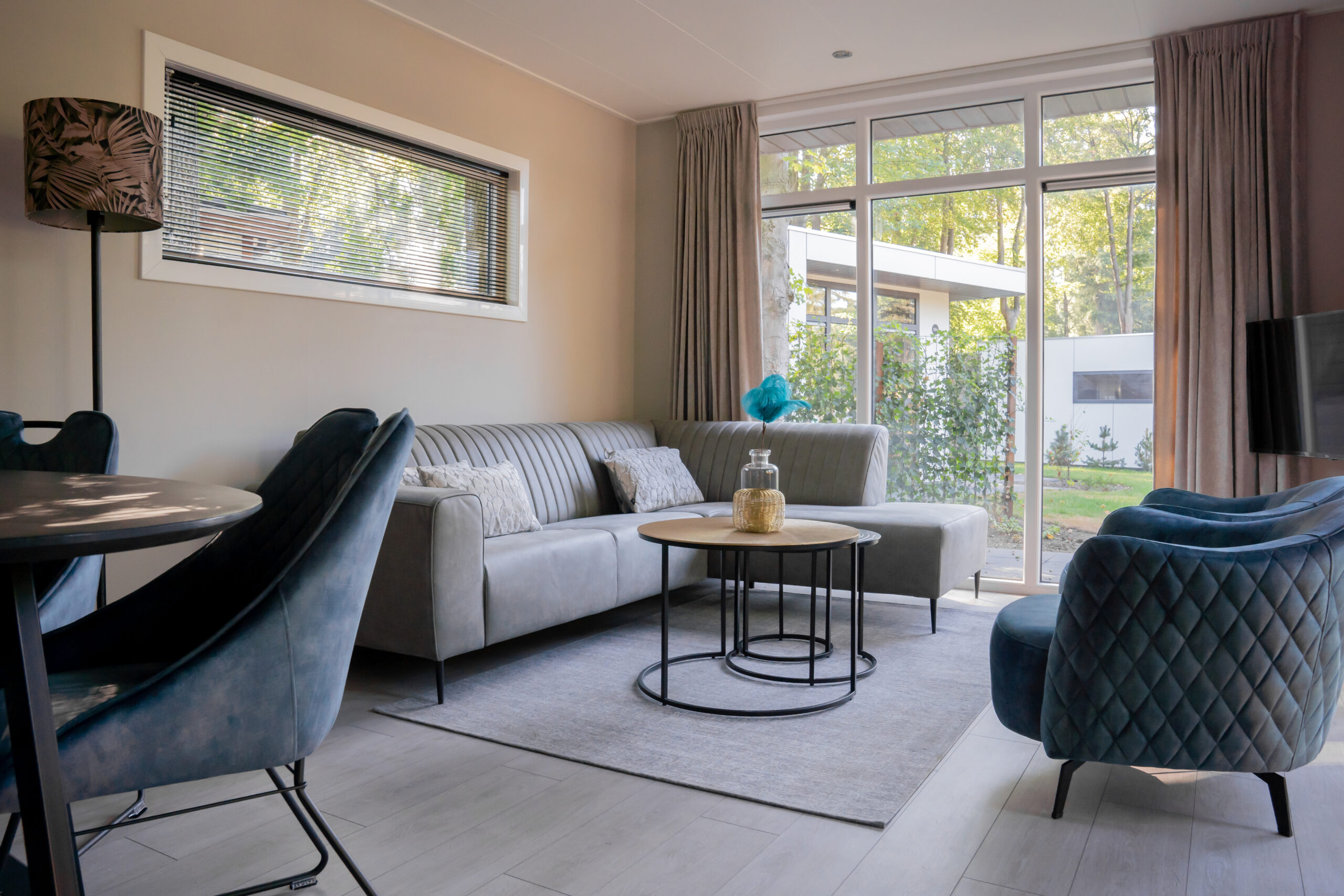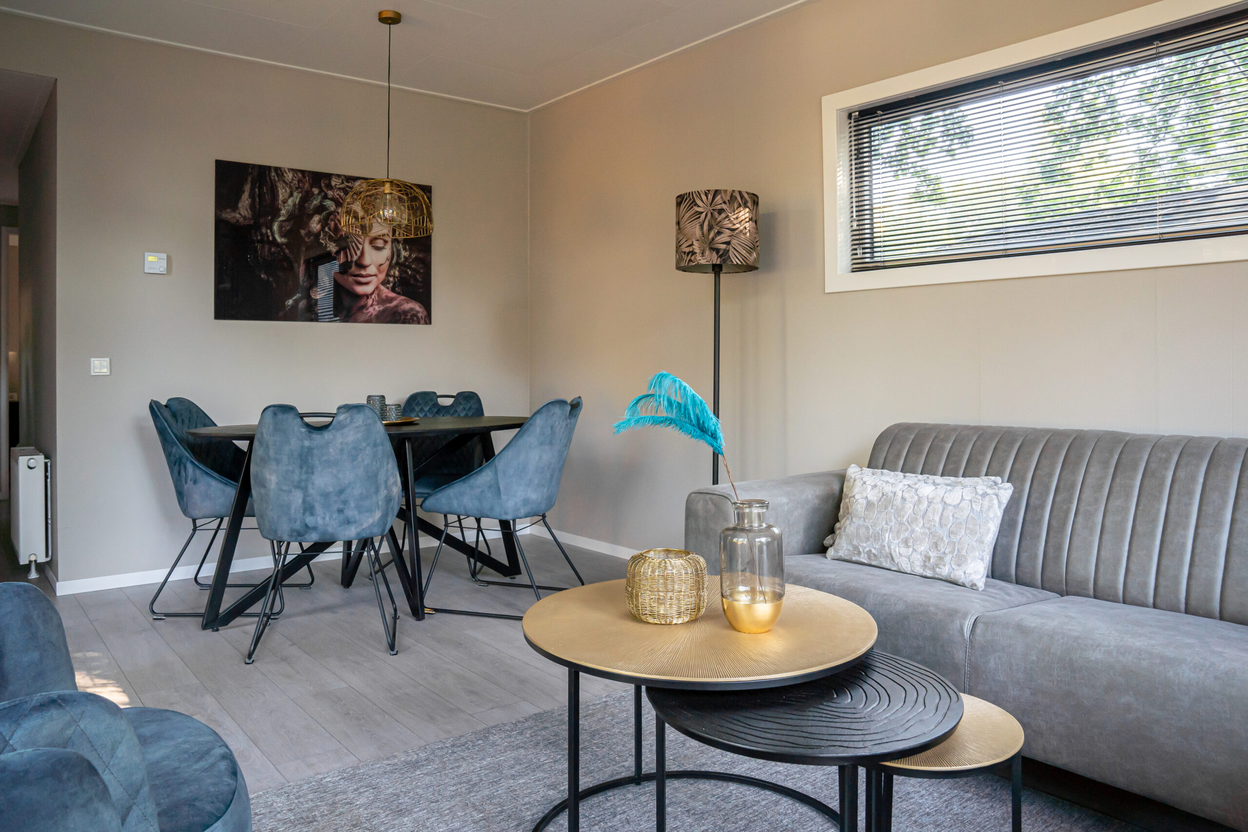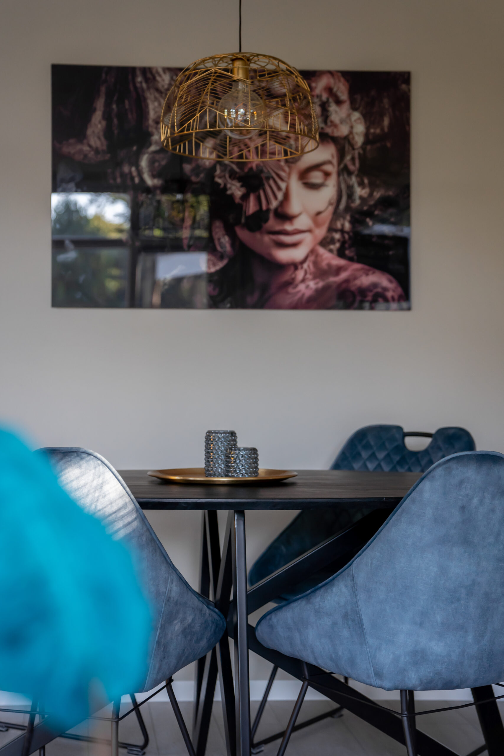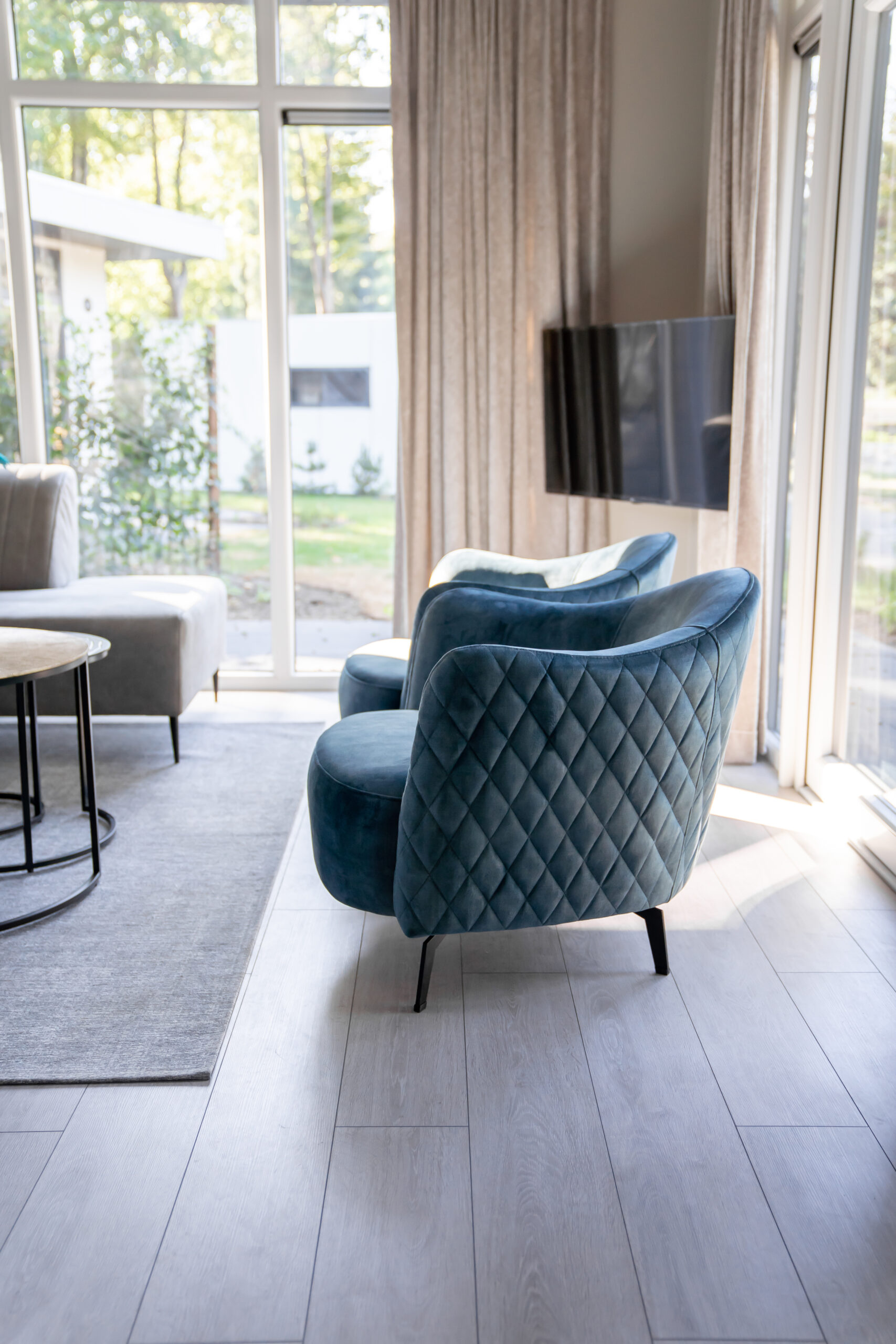 Deze prachtige vakantiewoning is ontworpen met frisse tinten blauw en grijs. Deze tijdloze kleuren geven een verfijnde uitstraling aan het interieur. Ze dienen als een mooie achtergrond voor andere accentkleuren en kunnen eenvoudig worden aangepast aan verschillende interieurstijlen, zoals modern, Scandinavisch, industrieel of klassiek. Om het interieur nog meer te verfraaien, hebben we een vleugje goud toegevoegd, wat een prachtig en luxueus effect geeft.